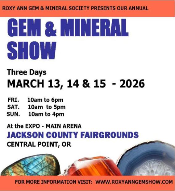 March 2026 7-8—CALDWELL, IDAHO: Annual show; Owyhee Gem & Mineral Society; O'Connor Field House, 2207 Blaine Street; Sat. 10-6, Sun. 10-5; $5 cash; Children 11 & under are free with an adult; Dealers; Demonstrations; Black light display; showcases; wheel of gems; sand dig; grab bags; silent auction; raffles; door prizes every 30 minutes plus grand prize giveaways; contact Susan Cassidy, (603) 548-8822; Email: pypnhot@comcast.net; Website: www.owyheerocks.com 7-8—ISSAQUAH, WASHINGTON: Annual show; East KingCo Rock Club; Pickering Barn, 1730 10th Avenue NW; Sat. 10-6, Sun. 10-5; $1 for adults and kids 12 and under free; Thirty gem, jewelry and mineral dealers, gem and mineral displays, stone sculpture exhibit, What's My Rock, door prizes, silent auction, kids' activities; contact Kim Villines, (425) 828-3872; Email: earthlightgems@aim.com; Website: eastkingco.org 7-8—VENTURA, CALIFORNIA: Annual show; Ventura Gem & Mineral Society; Ventura County Fairgrounds, 10 W. Harbor Blvd; Sat. 10-5, Sun. 10-4; Free (Fairgrounds charges for parking); Exhibits of gems, minerals, fossils & lapidary arts; jewelry-making demos; gold panning; raffle prizes & silent auctions; Second-Hand Treasures Store & plant sale; 15+ dealers; kids' activities & free resources for teachers. A So-Cal tradition for 6 decades & counting; contact Diane Cook, (805) 312-8467; Email: info@vgms.org; Website: www.vgms.org 13-15—APPLE VALLEY, CALIFORNIA: Annual show; Victor Valley Gem and Mineral Club; Apple Valley, 7 miles down Stoddard Wells Rd, P.O. Box 282; Fri. 9-5, Sat. 9-5, Sun. 9-5; Free; Come visit us for handcrafted and faceted jewelry, slabs and cabs, findings and equipment, minerals and fossils, TONS of rough material and lots of surprises; contact Ody Oriva, (760) 490-8401; Email: tailgate@vvgmc.org; Website: https://vvgmc.org/tailgate.html 13-15—CENTRAL POINT, OREGON: Annual show; Roxy Ann Gem and Mineral Society; The Expo - Jackson County Fairgrounds, 21 Peninger Road; Fri. 10-6, Sat. 10-5, Sun. 10-4; $5 - Under 12 are free; The Roxy Ann Gem and Mineral Society presents our annual gem and mineral show. There will be vendors with a wide variety of rough to polished specimens, live demos, a raffle, and activities for the kids; contact Liz Ellingson, OR; Email: GemShow@craterrock.com; Website: www.RoxyAnnGemShow.com 13-15—HILLSBORO, OREGON: Wholesale and retail show; Gem Faire; Westside Commons, 801 NE 34th Ave; Fri. 12-6, Sat. 10-6, Sun. 10-5; General admission $7, free admission for children under 12 years old; Fine jewelry, precious & semi-precious gemstones, millions of beads, crystals, gold & silver, unique gifts from around the world & much more at manufacturer’s prices. Buy directly from the importers & wholesalers. Jewelry repair & cleaning while you shop; contact Yooy Nelson, (503) 252-8300; Email: info@gemfaire.com; Website: http://www.gemfaire.com 14-15—SEATTLE, WASHINGTON: Annual show; North Seattle Lapidary & Mineral Club; Crown Hill Center, 9250 14th Ave NE; Sat. 10-5, Sun. 10-5; Free; Displays, junior activities, dealers, demonstrations, door prizes; contact Susan Gardner; Email: sgardner3@mindspring.com; Website: www.NorthSeattleRockClub.org 14-15—TURLOCK, CALIFORNIA: Show and sale; Mother Lode Mineral Society; Stanislaus County Fair Grounds, 900 North Broadway; Sat. 10-5, Sun. 10-5; $8 Adults; 12 and under free with paid adult; Educational family event. Crystals, minerals, beads, tools, equipment, animatronic dinosaur walk-about, fluorescent room, demos, large marine fossil exhibit with Megalodon & Mosasaur, fossils, gold panning, gemstone ID, raffle, kids activities, geode cutting, gem mining, food court, free parking; contact Mike Gibson; Email: mgibson_76@hotmail.com; Website: www.turlockgemshow.com 20-22—CLOVIS, CALIFORNIA: Annual show; Fresno Gem and Mineral Society; Clovis Rodeo Grounds, 748 Rodeo Drive; Fri. 10-5, Sat. 10-5, Sun. 10-4; $5 13 yr. and older; Family Fun and Educational! Silent Auctions, Door Prizes, geode cutting, Food Trucks; contact Daniel Bolm, (708) 821-7575; Email: danielbolm096@gmail.com; Website: https://www.fgms 20-22—PUYALLUP, WASHINGTON: Wholesale and retail show; Gem Faire; Washington State Fair Event Center, 110 9th Ave. SW; Fri. 12-6, Sat. 10-6, Sun. 10-5; General admission $7, Free admission for children under 12 years old; Fine jewelry, precious & semi-precious gemstones, millions of beads, crystals, gold & silver, unique gifts from around the world & much more at manufacturer’s prices. Buy directly from the importers & wholesalers. Jewelry repair & cleaning while you shop. Free parking; contact Yooy Nelson, (503) 252-8300; Email: info@gemfaire.com; Website: http://www.gemfaire.com 27-29—EUGENE, OREGON: Annual show; JOGS International Wholesale and retail show; Gem Faire; Lane Events Center, 796 W. 13th Ave; Fri. 12-6, Sat. 10-6, Sun. 10-5; General admission $7, Free admission for children under 12 years old; Fine jewelry, precious & semi-precious gemstones, millions of beads, crystals, gold & silver, unique gifts from around the world & much more at manufacturer’s prices. Buy directly from the importers & wholesalers. Jewelry repair & cleaning while you shop. Free parking; contact Yooy Nelson, (503) 252-8300; Email: info@gemfaire.com; Website: http://www.gemfaire.com 28-29—ANGELS CAMP, CALIFORNIA: Annual show; Calaveras Gem & Mineral Society; Calaveras County Fairgrounds, 2456 Gun Club Road; Sat. 10-5, Sun. 10-4; Adults $7/ Kids Free, 12 & under with paid adult; Over 25 Dealers Silent Auction Prize Drawing Demonstrations Kids Zone Gems, Jewelry, Minerals, Beads Exhibits - Mineral ID, Gold Panning Food Trucks; contact Sylvie Large, Show Chair, (907) 795-5035; Email: sylviedlarge@gmail.com 28-29—LANCASTER, CALIFORNIA: Annual show; Antelope Valley Gem and Mineral Club; Antelope Valley Fairgrounds, 2551 W Ave H; Sat. 10-5, Sun. 10-4; Admission is free; Parking will be $10; contact Susan Chaisson Walblom; Email: Slchaisson@yahoo.com 28-29